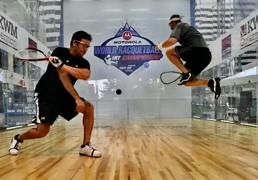 Racquetball is played with a small rubber ball on an indoor 20-foot-wide by 40-foot-long court. It is basically a box made of concrete or laminate with a hardwood floor. A door is set flush in the back wall, the wall sometimes made of tempered glass. The floor, walls, and ceiling are legal playing surfaces, with the exception that the ball off the racquet must not hit the floor first. Hinders are interference. It happens when somebody gets in the way. Unlike tennis, there is no net to hit the ball over, and, unlike squash, there is no out of bounds tin at the bottom of the front wall requiring the ball be hit above it.